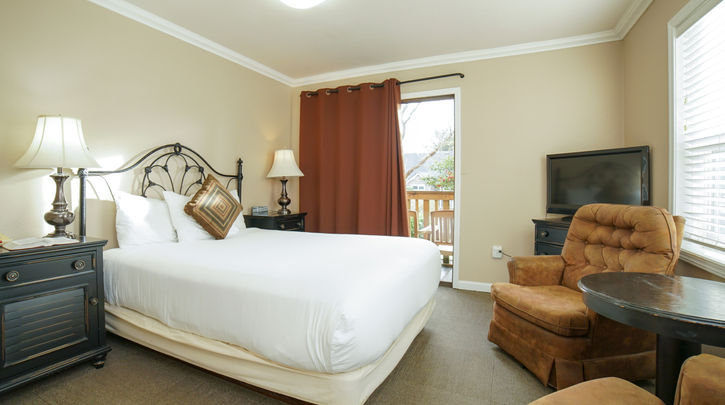 A notch up from our economy rooms, this deluxe room opens to a small furnished private deck overlooking the koi pond and courtyard, with views extending into the surrounding gardens. It offers a queen bed dressed in fresh linens, along with a Roku TV for entertainment. Thoughtfully equipped for convenience, it includes a mini refrigerator, microwave, and a single-serve K-Cup coffee maker. A pair of lounge chairs with a table provides a pleasant space to relax indoors.